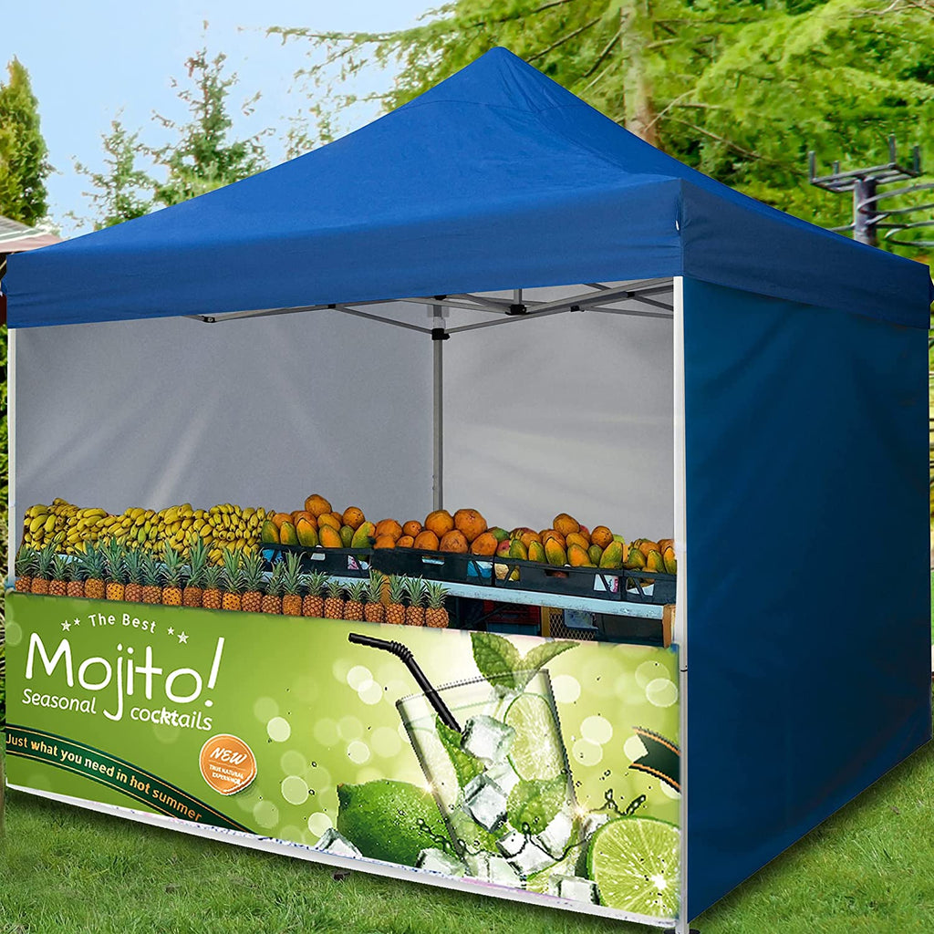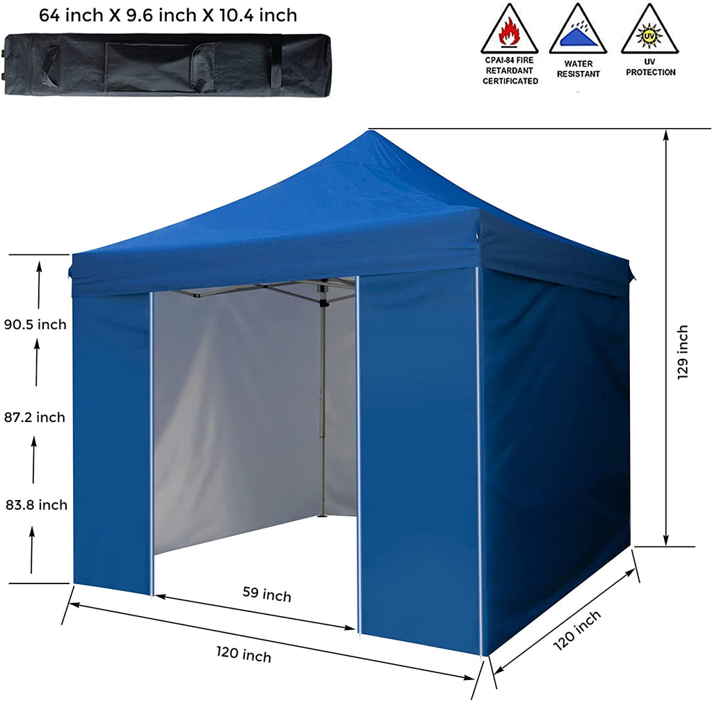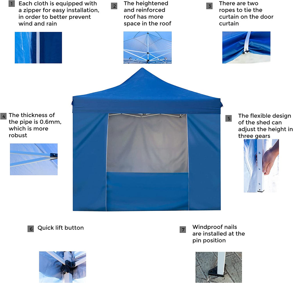 [commercial 300 denier tarpaulin] this 10x10 pop-up awning is of better quality than the standard tarpaulin. It is made of commercial 300 denier blue fabric. The silver plated surface can effectively block ultraviolet rays, resist fading and has good flame retardancy. The side wall of the awning is supported by a solid and durable steel frame, and the white powder coating can prevent the product from rusting. The warranty period is 1 year.
